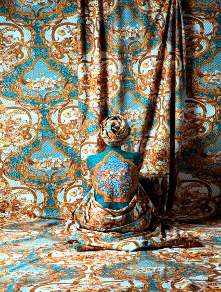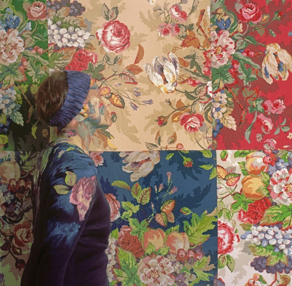 Elle se met en scène en peignant ( le plus souvent seule, ou parfois avec l’aide d’une assistante pour un rendu parfait, lorsqu’elle ne peut y arriver ) une partie de la peau de son corps, ou le corps entier, d’un motif similaire au tissu qui sert de décor, de paysage pourrait-on dire, et se fond dans celui-ci comme un camouflage. Le tout devient un tableau, une œuvre d’art qu’elle place face à une caméra pour en faire une photo . C’est un travail d’autoportrait photographique et pictural très original, assez incroyable et surprenant.