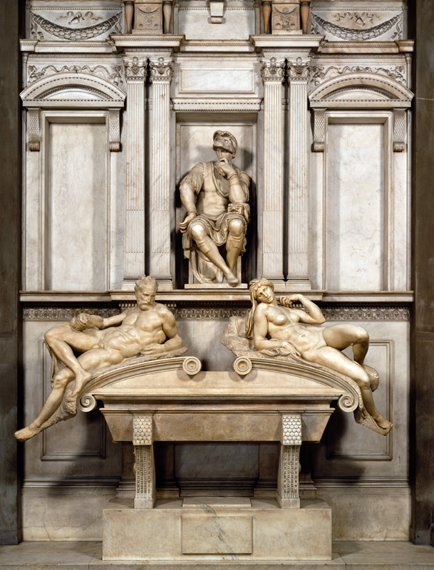L’inspiration vient de la statue de Michel Ange qui domine le tombeau de Laurent de Médicis en l’église San Lorenzo à Florence.