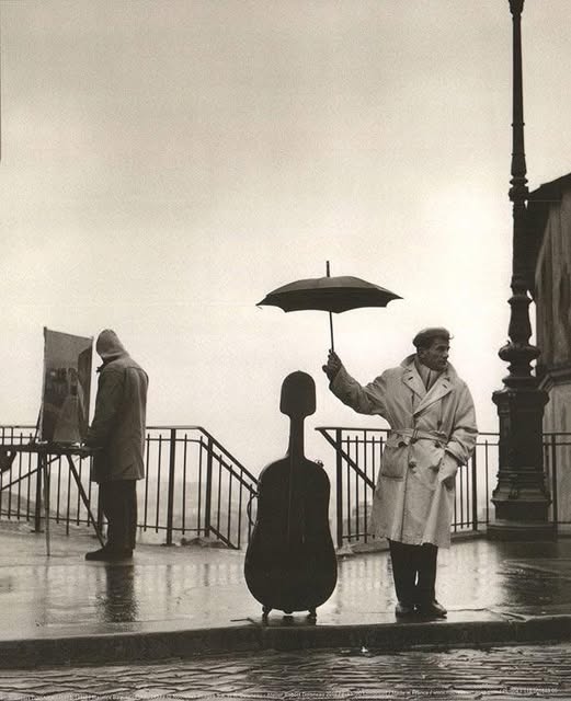 Le violoncelle sous la pluie à Paris 1957 (Maurice Baquet sur la phot) – Robert DOISNEAU