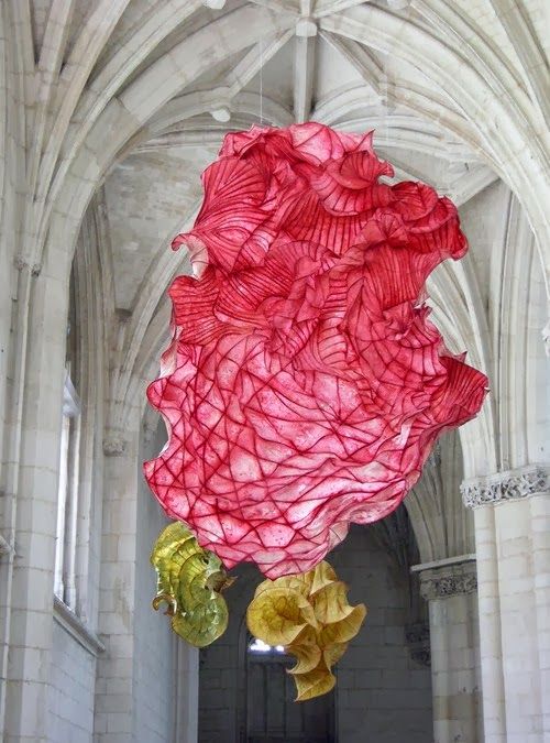 Ses œuvres, fragiles et fortes à la fois, faites de papier avec nervures en bambou,  sont souvent exposées dans des endroits  où l’on a pas forcément l’habitude de les voir mis à part dans des salles d’exposition, à savoir : des hôtels, des églises, des podiums de mode, mais aussi des lieux historiques etc… où elles sont confrontées alors à la lumière naturelle des fenêtres, des vitraux ou des spots et jouent avec elles.