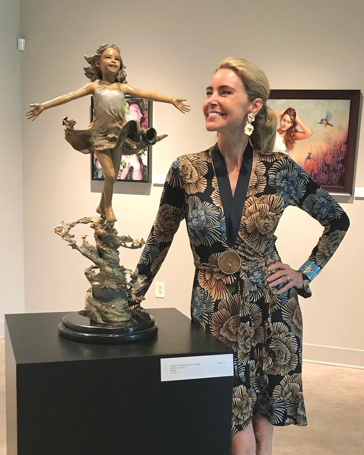 » Ce qui donne aux artistes l’espoir, c’est de savoir que nous pourrons continuer de partager ce qui est créé par notre esprit, nos mains et notre cœurs. Pour chacune de mes sculptures, je fais souvent appel à ma mémoire, à savoir que je travaille toujours avec la vision d’un modèle, un modèle rayonnant de lumière et d’esprit. Je travaille à un rythme effréné pour m’assurer que rien n’échappe à ma compréhension de ce que je vois. Au fur et à mesure que la sculpture se développe, je ralentis et me concentre sur les détails bien caractéristiques du sujet. Après je passe des heures à étudier les autres ajouts tels que les vêtements, les objets. En signant mes œuvres lorsqu’elles sont achevées, j’ai du mal à résister au frisson de la création. J’ai le sentiment très fort que rien n’est finalisé, que tout continue à se développer et grandir dans ma tête. En raison de la passion qui habite mes sculptures, j’espère que mon travail transmette toutes ces émotions à celles et ceux qui contemplent mon travail. » Angela-Mia De LA VEGA (Sculptrice américaine)