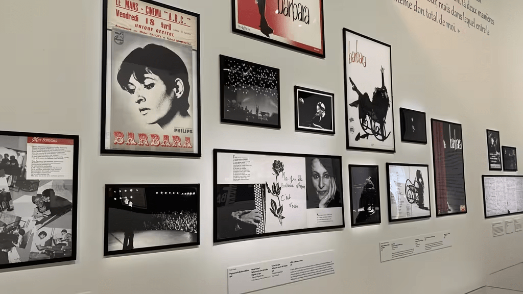 L’expo s’intitule : Dis quand reviendras-tu ? Barbara et son public … Jusqu’au 5.3.2026 – Elle nous permet de nous replonger dans l’univers de cette chanteuse et rassemble un grand nombre de documents sur sa carrière entre 1981 et 1997, des partitions, des coupures de presse, des affiches, des programmes, des photos et bien sur des vidéos où l’on peut la voir chanter ses plus belles chansons. (J’en ai choisi quelques-unes pour illustrer cet article)