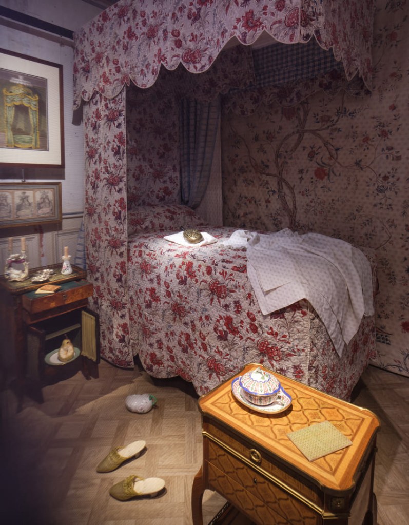 C’est franchement une très belle expo où l’on a reconstitué les pièces d’une riche demeure de l’époque. Les organisateurs ont imaginé qu’elle pourrait se situer rue du Faubourg Saint-Honoré à Paris. On passe d’abord sous un porche assez majestueux avec un portail imposant , on entre dans la cour , puis on se promène dans un jardin, (ce dernier était un privilège car rare en ville. Il permettait de vivre en retrait de la rue bruyante ) , puis dans le boudoir de madame, le cabinet de travail de monsieur, l’oratoire, la salle à manger, le cabinet de toilette etc…. . Tout a été étudié pour que l’on ait l’impression » d’avoir été invité à visiter ce lieu de pièce en pièce en tant que proche ou ami privilégié de la famille qui habite là « .