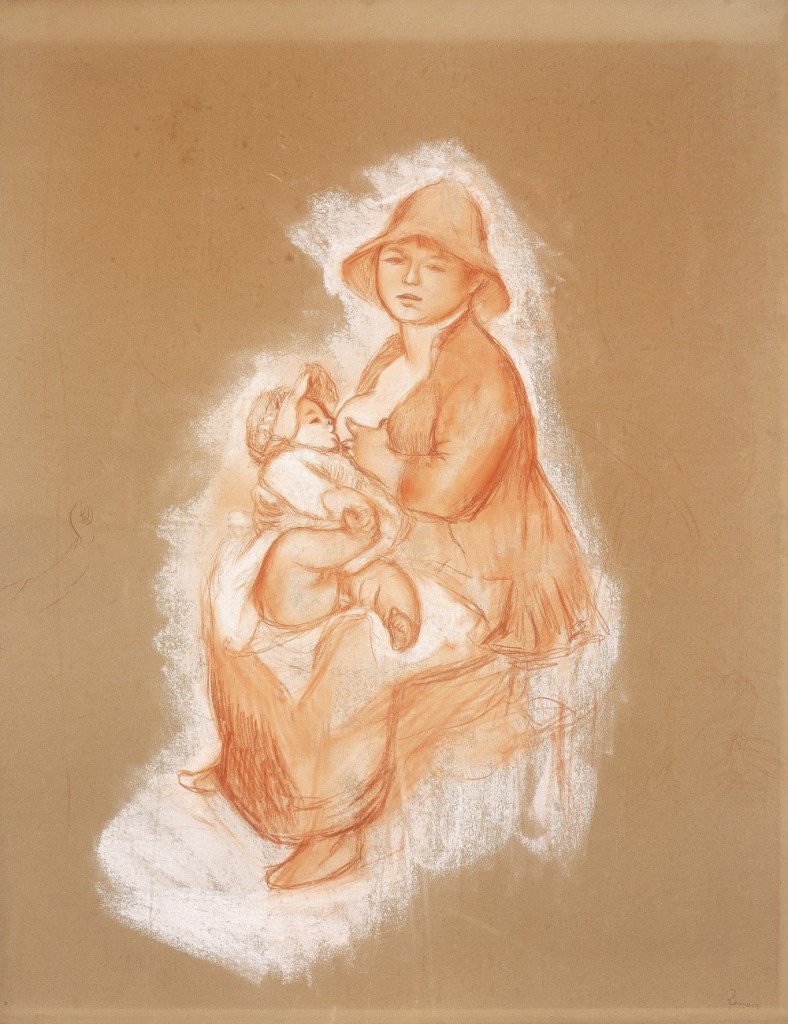« Visite chez Renoir : sur un chevalet, dessin au crayon rouge et à la craie, d’après une jeune mère allaitant son enfant. C’est charmant de grâce et de finesse ! Comme je l’admirais, il m’en a montré une série d’après le même modèle et, à peu de choses près, dans le même mouvement. C’est un dessinateur de première force. Toutes ces études préparatoires pour un tableau seraient curieuses à montrer au public qui s’imagine, généralement, que les impressionnistes travaillent avec la plus grande désinvolture. Je ne crois pas que l’on puisse aller plus loin dans le rendu de la forme. Deux dessins de femmes nues entrant dans la mer me charment au même point que ceux d’Ingres…. » Berthe MORISOT (Peintre française – Propos notés dans l’un de ses carnets, après une visite chez Renoir en janvier 1886)
