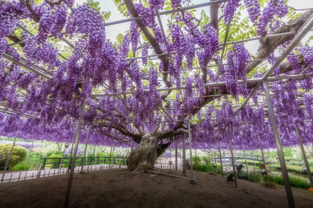 De plus, entre avril et mai, la floraison des glycines , au pays du Soleil-levant, à donner lieu à des fêtes traditionnelles dans des parcs célèbres qui lui sont tout spécialement réservés comme le sanctuaire Kameido Tenjin, le Jardin Kawachi à Kitakyushu, ou mieux encore là où se trouve le plus beau spécimen d’arbre-glycine au monde, à savoir au parc floral Ashikaga de Tochigi qui, depuis de très nombreuses années, fait l’objet de soins particulier et méticuleux pour le préserver car il est âgé de 130 ans. Il s’étend sur 1000 m/2 et la préfecture de la ville l’a désigné comme monument national.